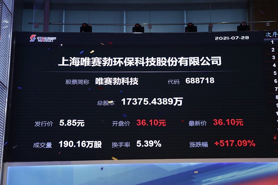 2021年7月28日,上海唯赛勃环保科技股份有限公司(证券代码:688718)在我所举行上市仪式。