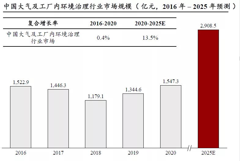 未来,预计中国大气及工厂内环境治理行业市场规模在2025年将达到2,908.5亿元人民币,年复合增长率达13.5%,进入全新增长期。