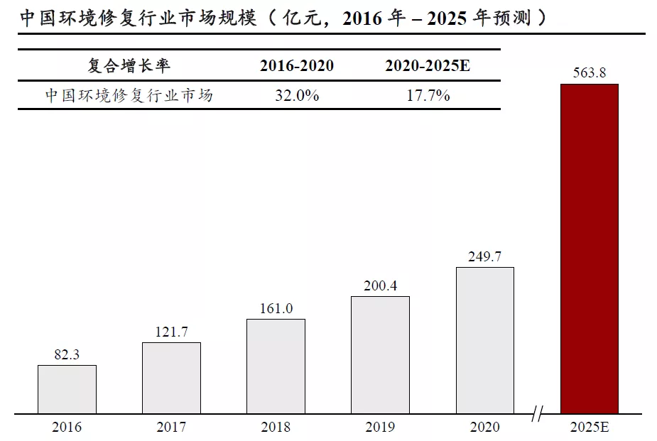 过去五年,中国环境修复行业市场规模从2016年的82.3亿增长到2020年的249.7亿元人民币,年复合增长率达32.0%;