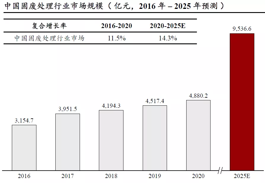 过去五年,中国固废处理行业市场规模从2016年的3,154.7亿增长到2020年的4,880.2亿元人民币,年复合增长率达11.5%;