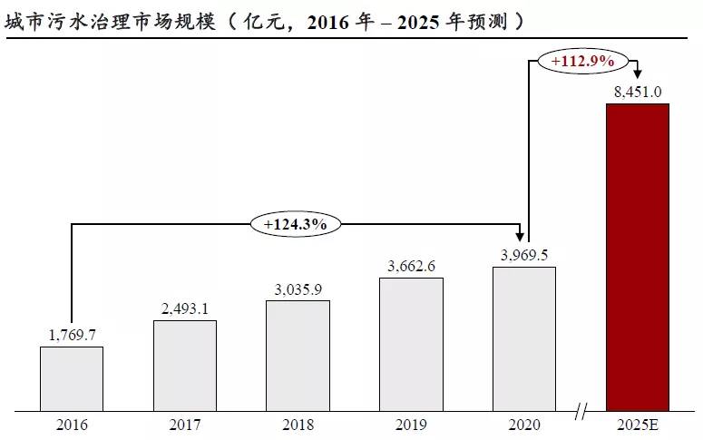 过去五年,中国城市污水处理领域市场规模从2016 年的1,769.7 亿增长到2020 年的3,969.5亿元人民币,年复合增长率达124.3%;未来,预计中国城市污水治理领域市场规模在2025 年将达