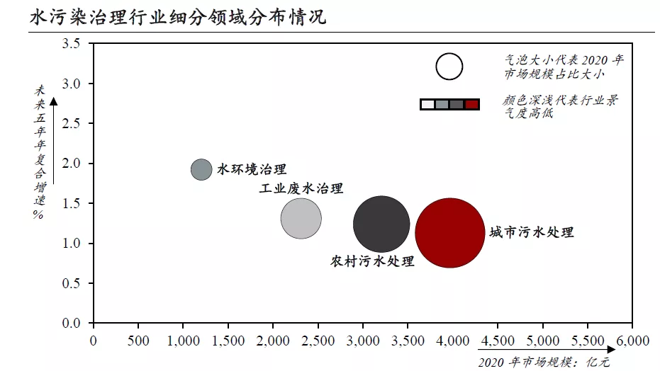 1)水污染治理行业作为环保领域最为成熟的板块,市场规模巨大,其中城市污水治理、农村污水处理、工业废水处理是三大主要的应用场景。