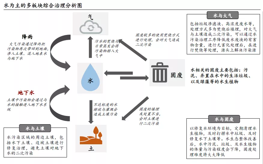 水污染治理与固废处理协同。水环境中污染物包括污泥、弃置水中的垃圾以及富营养化导致的水生植物等,而固废处理的焚烧与填埋方式,将把大量污染物释放至土壤与大气,并通过循环再次进入到水体。