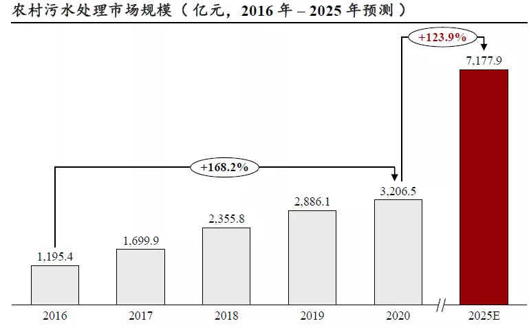 过去五年,中国农村污水处理领域市场规模从2016 年的1,195.4 亿增长到2020 年的3,206.5 亿元人民币,年复合增长率达168.2%;